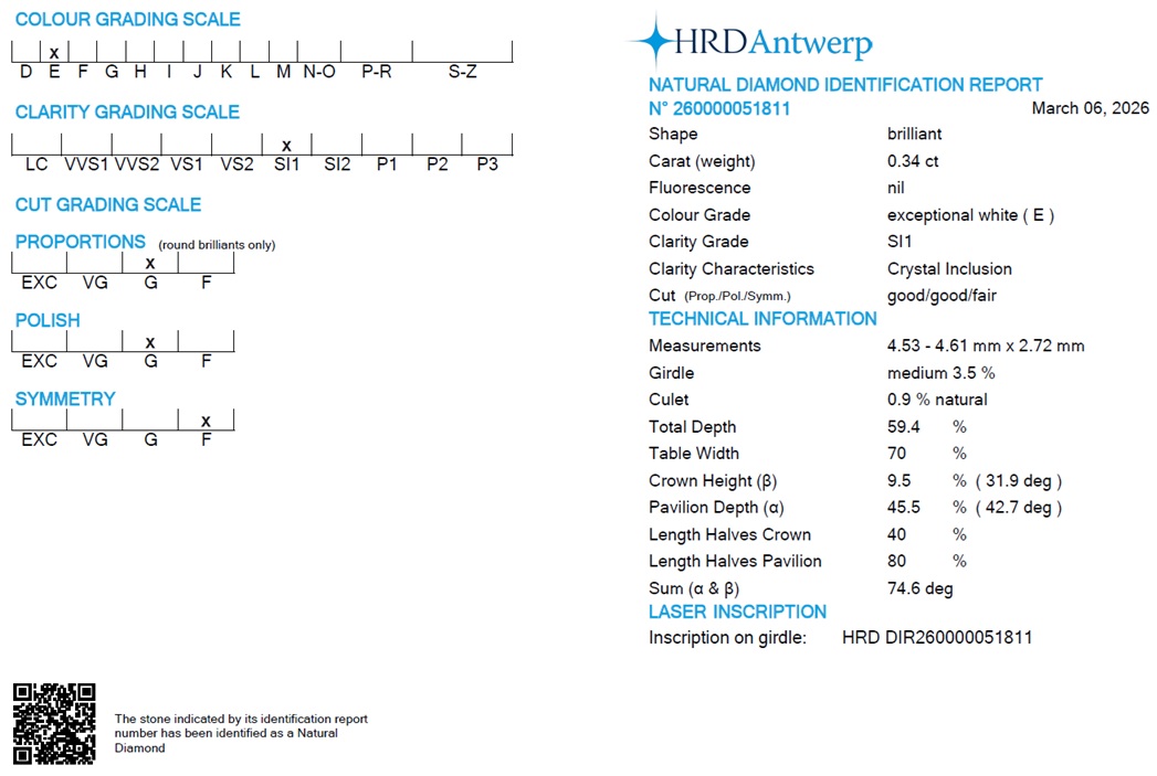 0.34 ct brilliant cut diamond. E/SI1. HRD certificate. Laser inscription