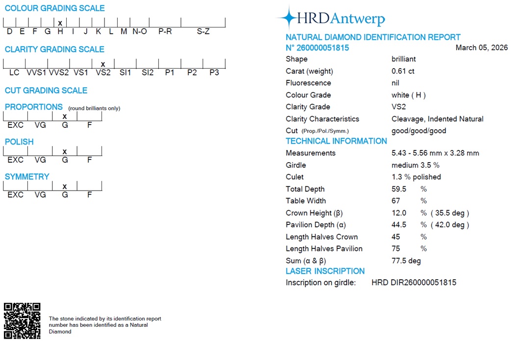 0.61 ct brilliant cut diamond. H/VS2. HRD certificate. Laser inscription