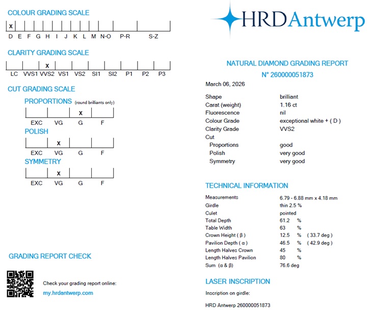 1.16 ct brilliant cut diamond. D/VVS2. HRD certificate. Laser inscription. Sealed in blister