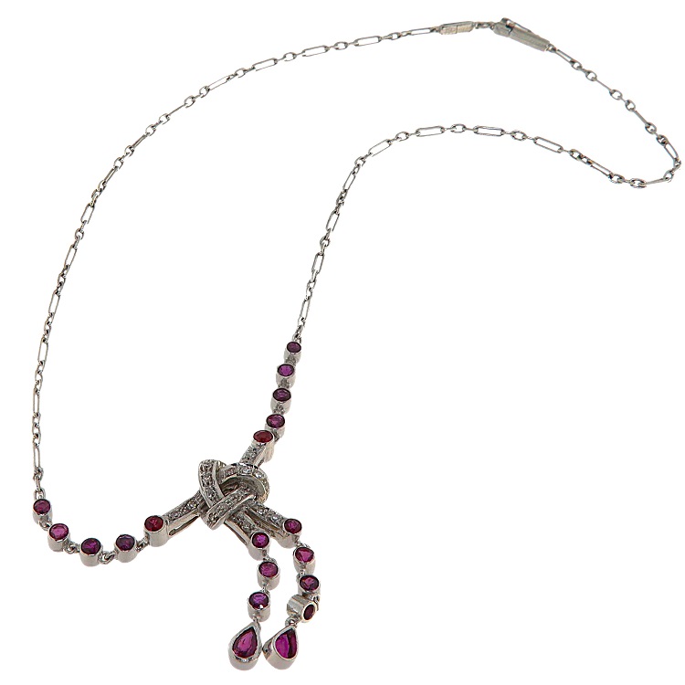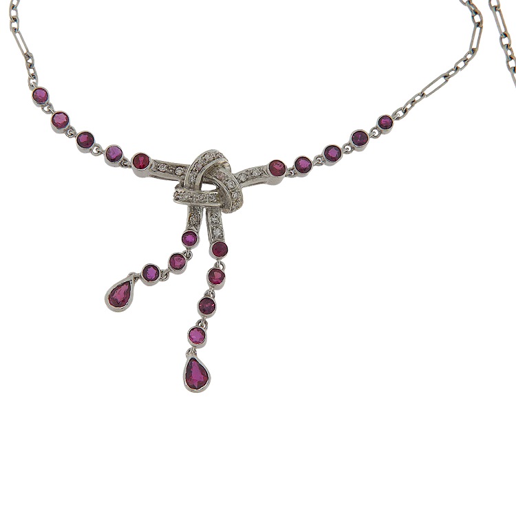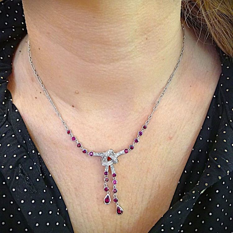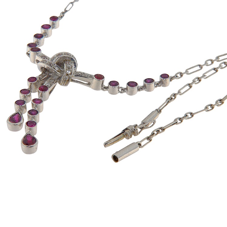 18kt white gold necklace with rubies and 0.21ct huit-huit cut diamonds