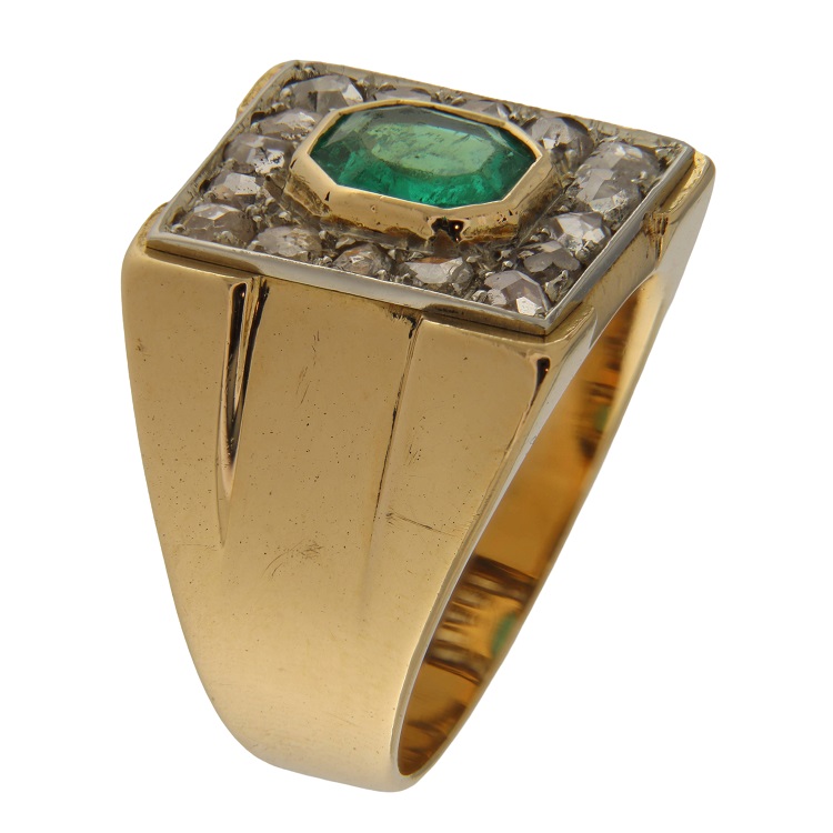 18 kt yellow gold vintage ring with 0.90 ct emerald and 0.48 ct rose cut diamonds
