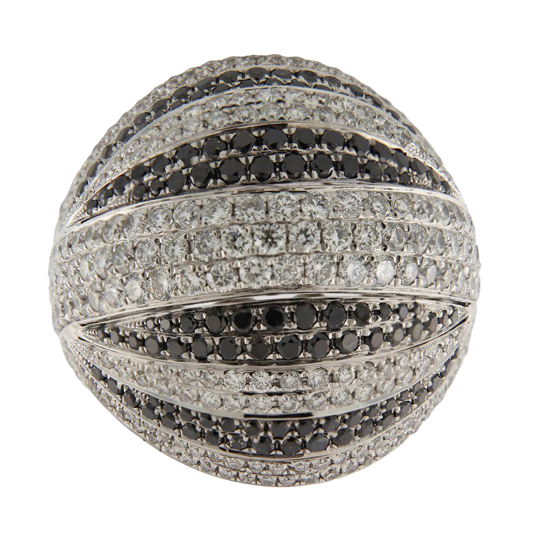 Anello cupola vintage in oro bianco 18 kt con pavé di diamanti taglio brillante bianchi e neri 4,33 ct