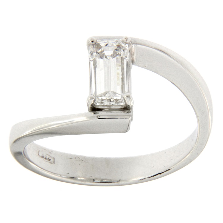 Anello solitario in oro bianco 18 kt con diamante taglio smeraldo 0,83 ct E/IF