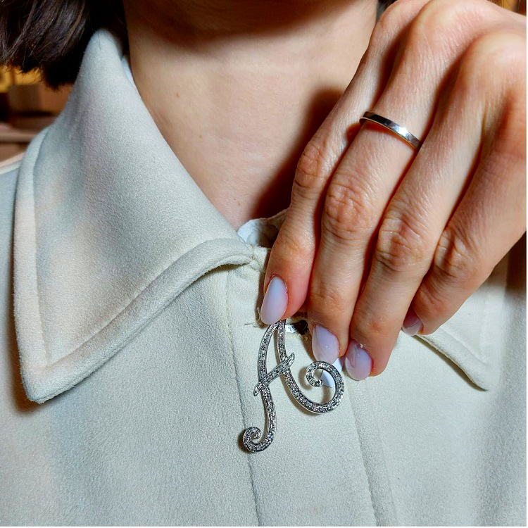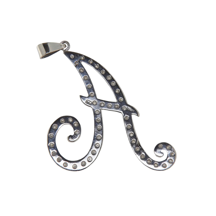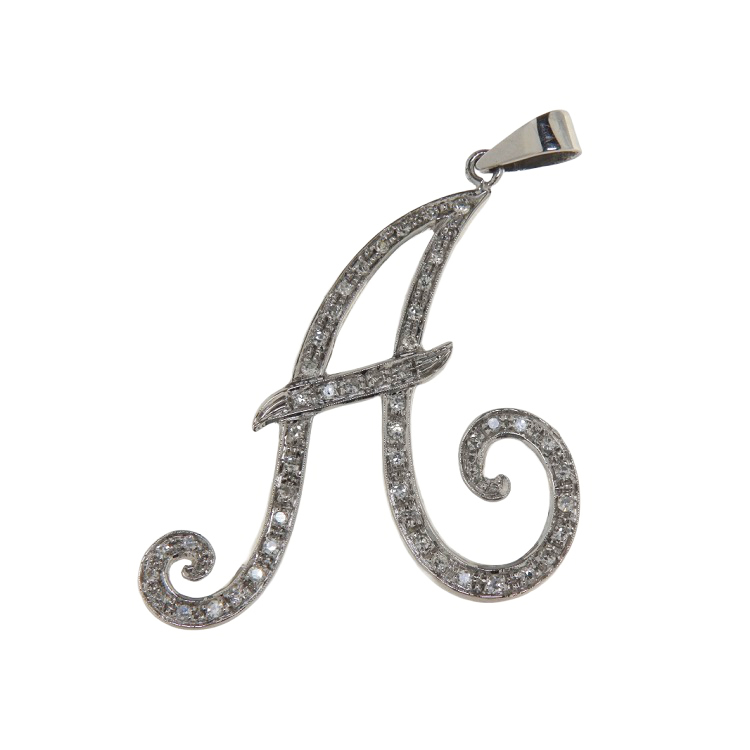 Ciondolo vintage in oro bianco 18 kt a forma di A ricoperto di diamanti taglio huit-huit 0,35 ct