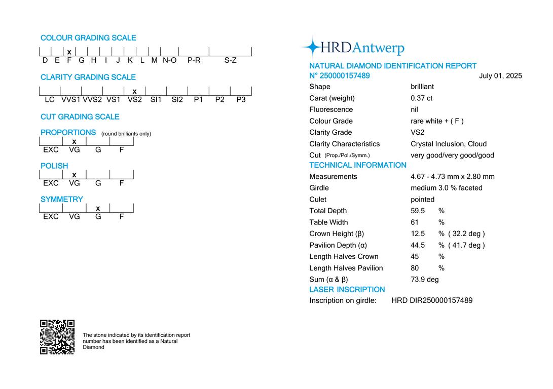 Diamante taglio brillante 0,37 | F | VS2 | HRD