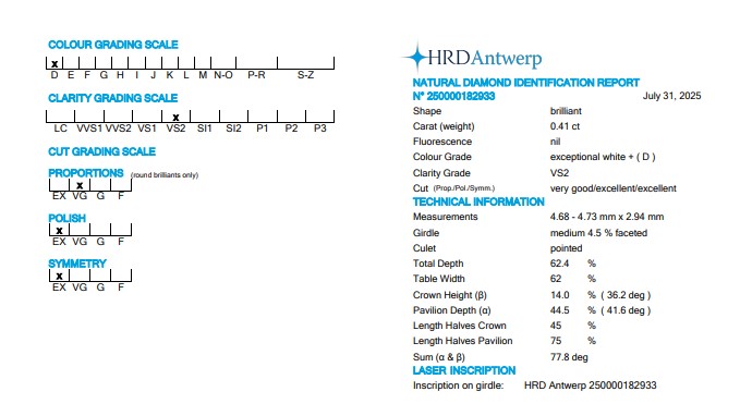 Diamante taglio brillante 0,41 | D | VS2 | HRD