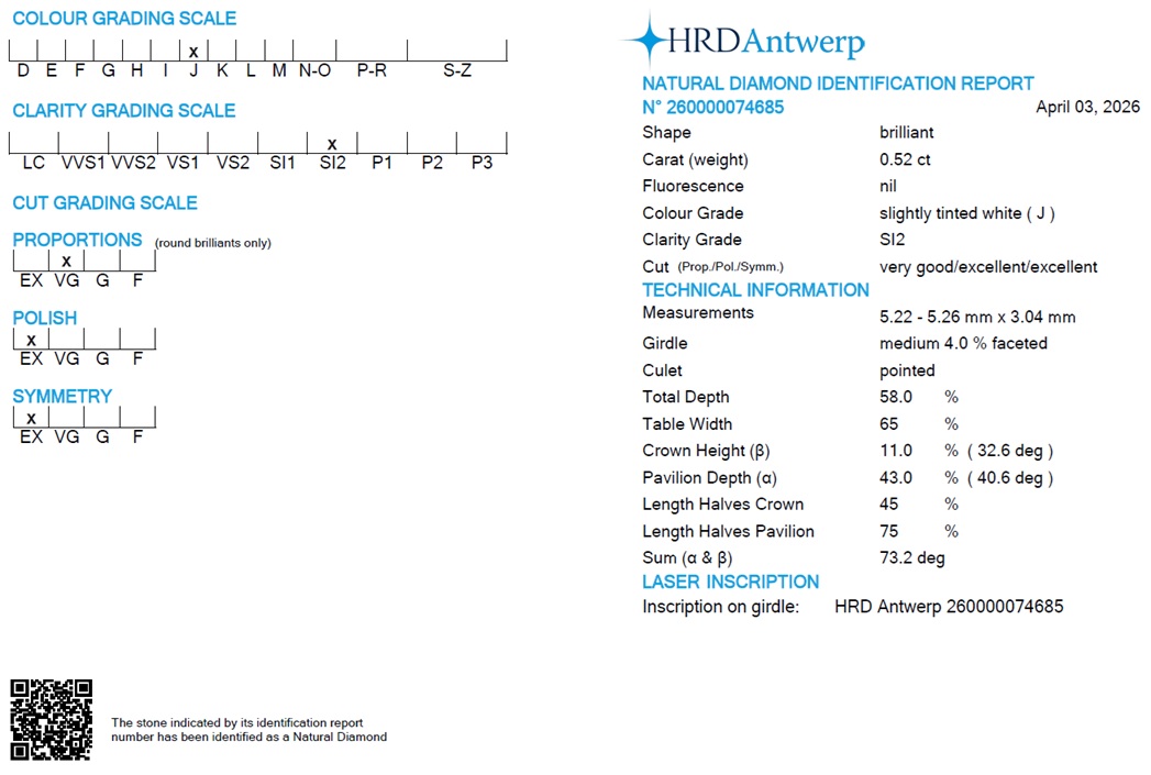 Diamante taglio brillante 0.52 ct. J/SI2. Certificato HRD. Incisione laser